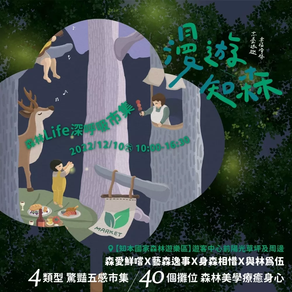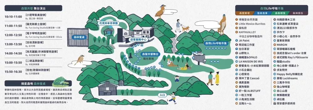有「森林市集 X 療癒音樂 X 走讀導覽 X 浪漫餐桌」