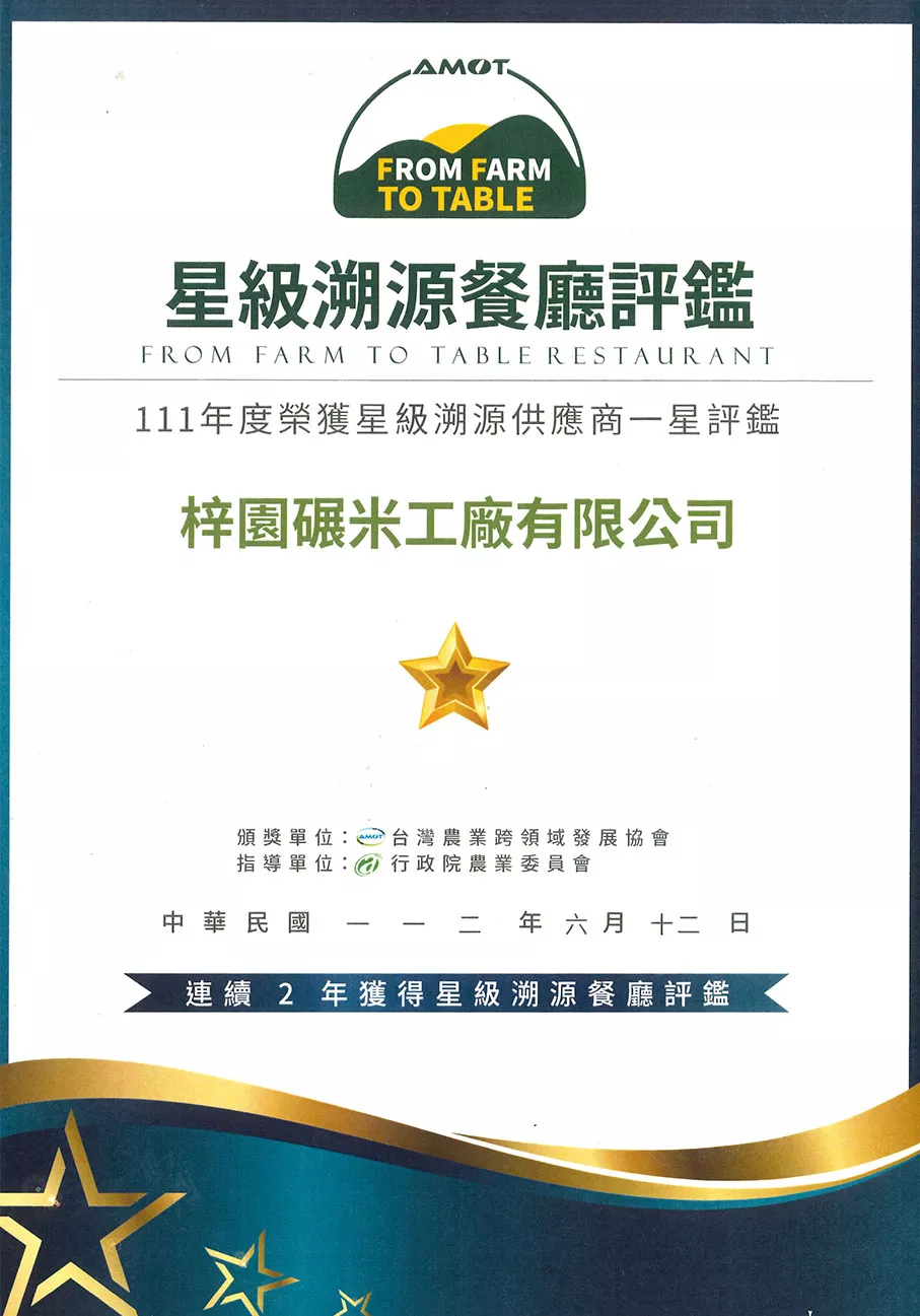 - 111、110年度AMOT星級溯源餐廳評鑑 榮獲「星級溯源供應商一星評鑑」